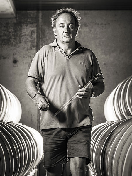 By 2008, he was able to modify his cellar, with air-conditioning and new presses, helping to refine a winemaking practice he describes as “infusion,” rather than “extraction.” He allows the grapes and stems to macerate, chilled, before fermentation spontaneously begins, usually after about a week. Then he uses the inclined presses to mimic the action of an old-style vertical basket press in the way it recirculates the pomace, allowing him to “liberate the juice” from the grapes for his press wine. The gentle pressing gets an assist from all the stems in the must. In the ripe and abundant 2018 harvest, he did not destem any fruit, using all the whole bunches in his tank; more typically, he destems between 20 and 40 percent.